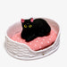 Valkoinen lemmikin kori vaaleanpunaisella pehmusteella. Soikean mallinen kori on noin 3.6 x 4,5 cm. Laitojen korkeus on 1,5 cm.