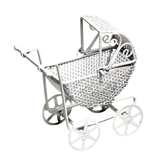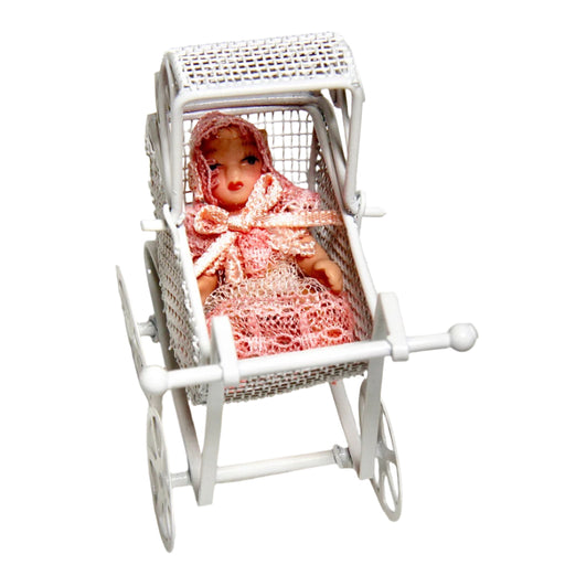 Katso kaikki tiedotValkoiset lastenvaunut ovat metallia. Pyörät pyörivät, mutta kuomu ei liiku. 11,5 x 7 x 6 cm. valkoiseksi maalattua metallia. Vaaleanpunainen kuomu...