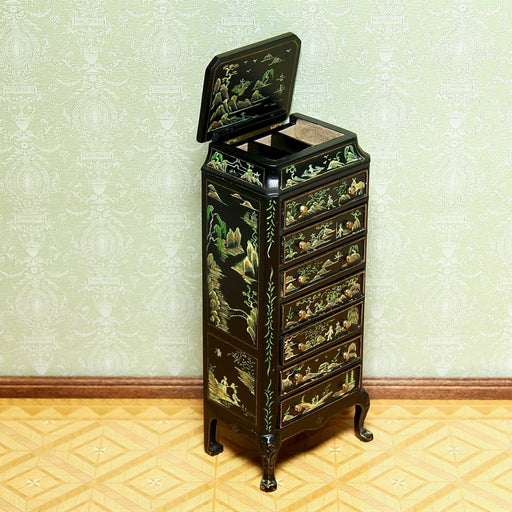 Katso kaikki tiedotKorkealaatuinen nukkekodin kaappi kiinalaisvaikutteisin koristemaalauksin. Kaapin sisällä pienen pieniä avautuvia laatikoita. Katso lisää tuotekort...