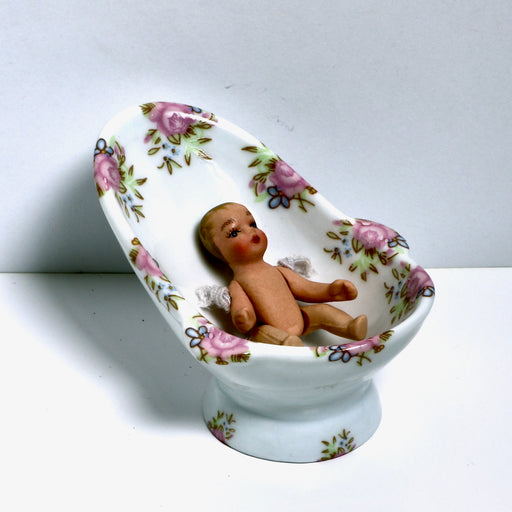 Katso kaikki tiedotKaunis posliininen pesuallas nukkekodin kylpyhuoneeseen on koristeltu herkin ruusukuvioin ja kultaisilla yksityiskohdilla. Kultaiset miniatyyrihana...