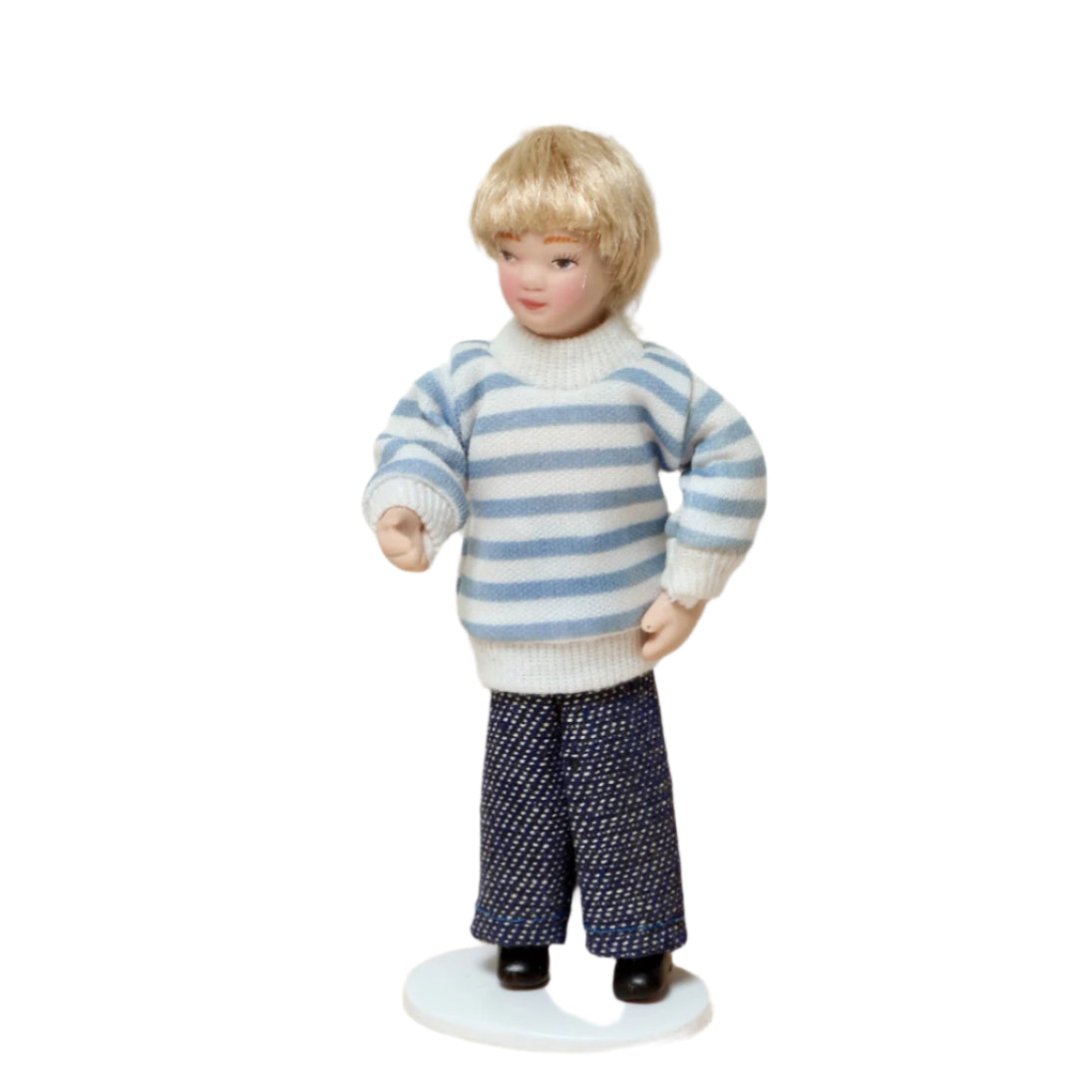 Katso kaikki tiedotNuori mies farkuissa ja raitapaidassa.Nuken pää, kädet ja jalat ovat posliinia. Taipuvat jäsenet. Pituus noin 14,5 cm eli sopii 1:12 mittakaavan nu...