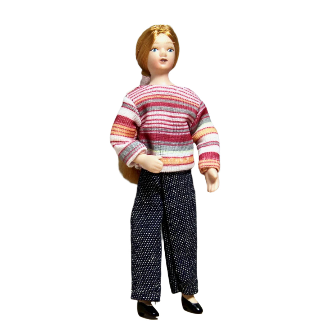 Katso kaikki tiedotPieni nukkekodin nukke on iloinen nuori tyttö modernissa asussaan. Valkoisen takin alta pilkottava pusero on pikkuruisten kenkien kanssa samaa sävy...