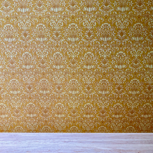 Katso kaikki tiedotTämä nukkekodin tapetti on puolikiiltävää paperia ja arkin koko on leveys 49 x korkeus 32 cm. Klassisen kuvion väri on kirkas keltainen, joka taitt...