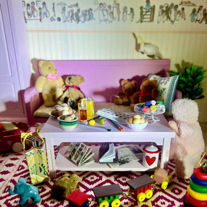Klassinen sohvapöydän malli, joka sopii yhtä hyvin perinteiseen kuin moderniinkin nukkekotiin. Pöydän alahylly toimii hyvänä säilytystilana lehdille, kirjoille ja muille olohuoneen tarvikkeille.