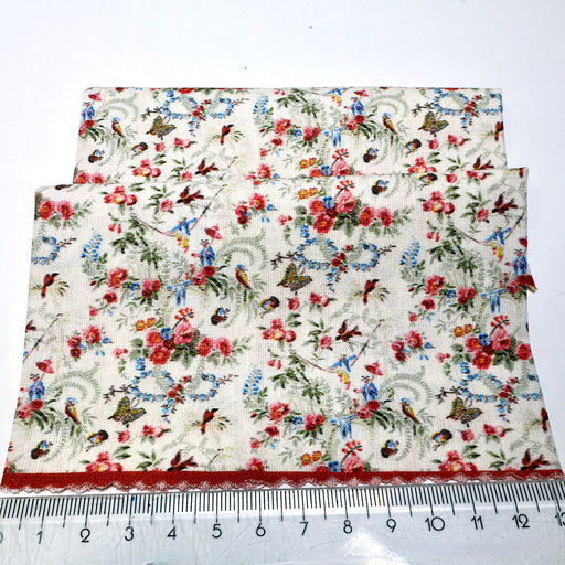 Pienikuvioinen puuvillakangas kukilla sopii miniatyyritekstiilien tekoon ja tilkkutöihin. Kankaan koko 30 x 45 cm.