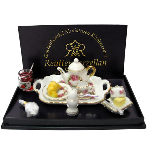 Katso kaikki tiedotSaksalaisen Reutterin laadukkaat miniatyyriastiat ja mannermainen aamiainen. Miniatyyriposliiniastiat sopivat 1:12 mittakaavan nukkekotiin.