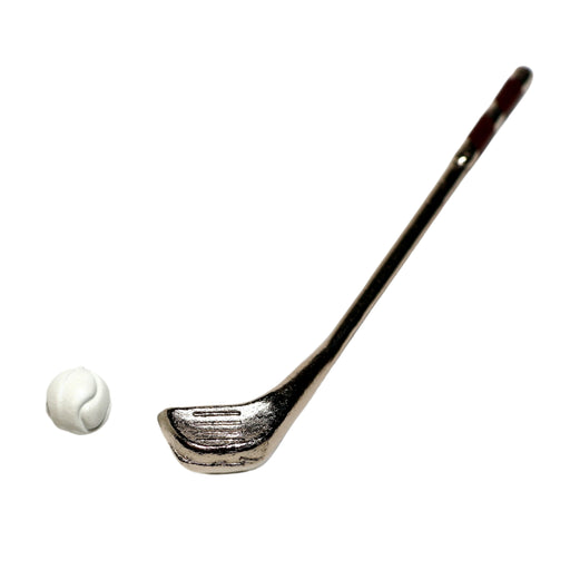 Katso kaikki tiedotMetallinen golf draiverin ja pallon pienoismalli. Mailan pituus on noin 7 cm.