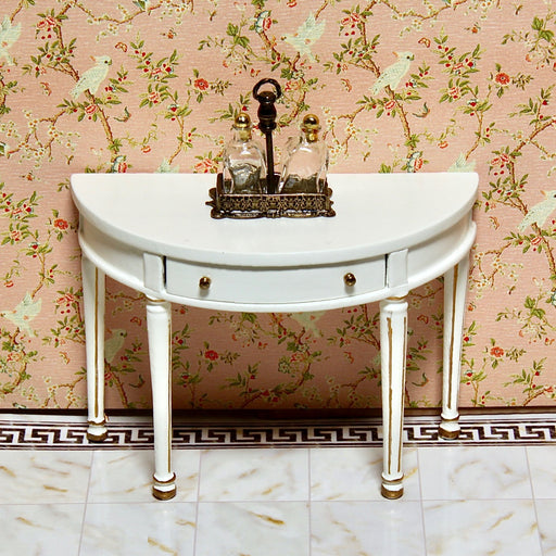 View full detailsA semi-circular table with an opening drawer. The table top is approximately 9 x 4.5 cm x table height 6.5 cm. The graceful table is bone-white p...