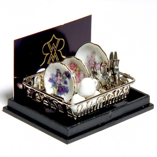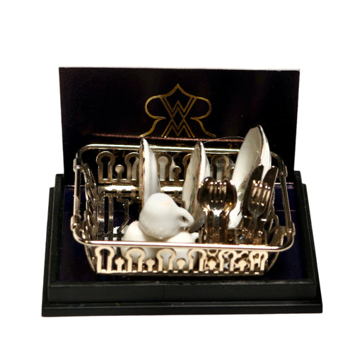Dish drying rack and high-quality miniature porcelain for a dollhouse kitchen. In the finished set, all products are glued to a chrome-colored dryi...