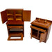 The doors and hatches of the dollhouse furniture open. The material is brown-tinted wood.