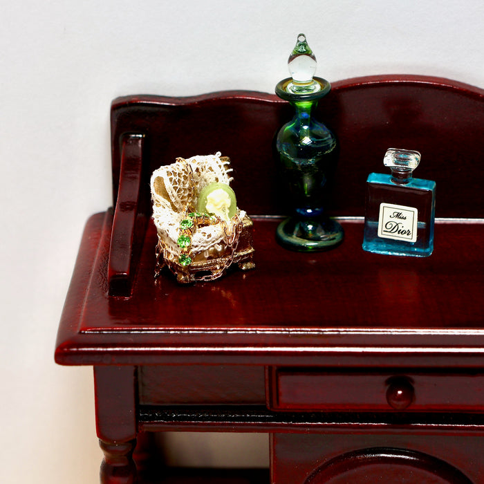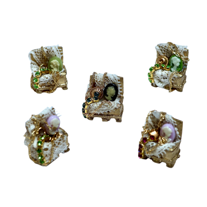 A tiny miniature for a dollhouse woman, perhaps as a dressing table decoration. The dimensions of the handmade dollhouse product are approximately 1.3 x 0.8 cm x height 1.6 cm. The jewelry box is made of metal and each individual is slightly different.