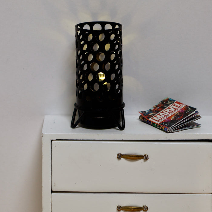 The modern dollhouse lamp is battery-operated and the battery is pre-installed. This striking metal miniature lamp creates an interesting shadow on the wall. The small lamp works both as a table lamp and as a mood light on the floor.
