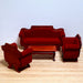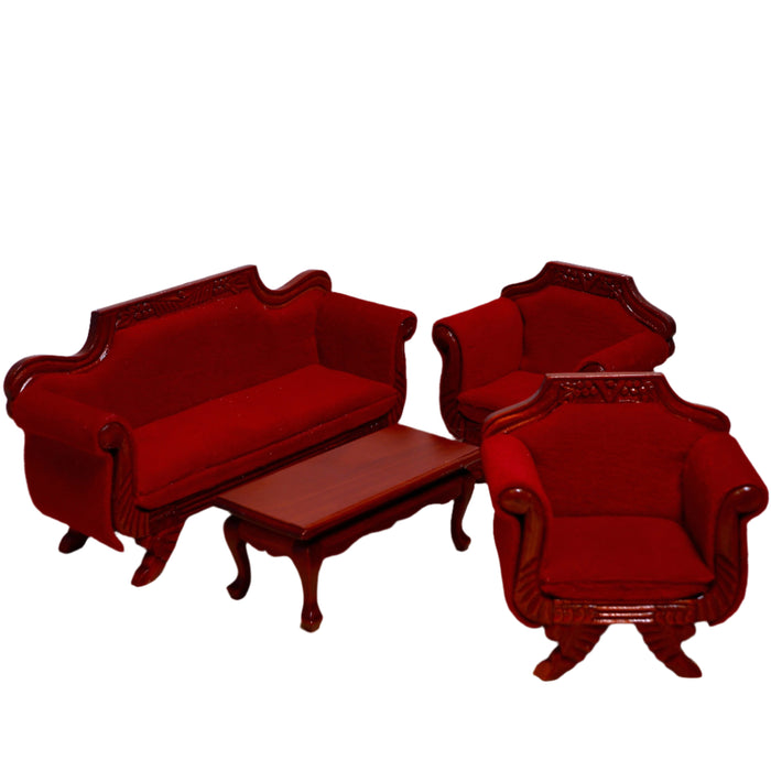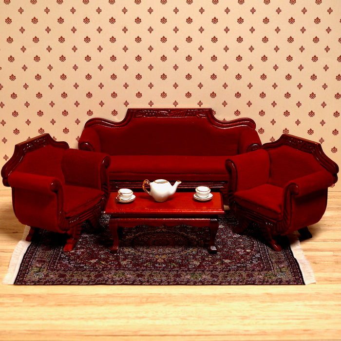 An impressive furniture set for a historical interior: A wide sofa, two armchairs and a coffee table. The furniture for the dollhouse's living room is made of walnut wood and upholstered in dark red velvet.