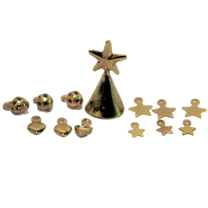 Miniatyrdekorationer i sortimentet: 3 julkulor, 6 stjärndekorationer i två storlekar, 3 miniatyrhjärtan och en stor stjärna i änden av konen, som kan monteras på dockskåpsbordet eller limmas som en stjärna på granen.