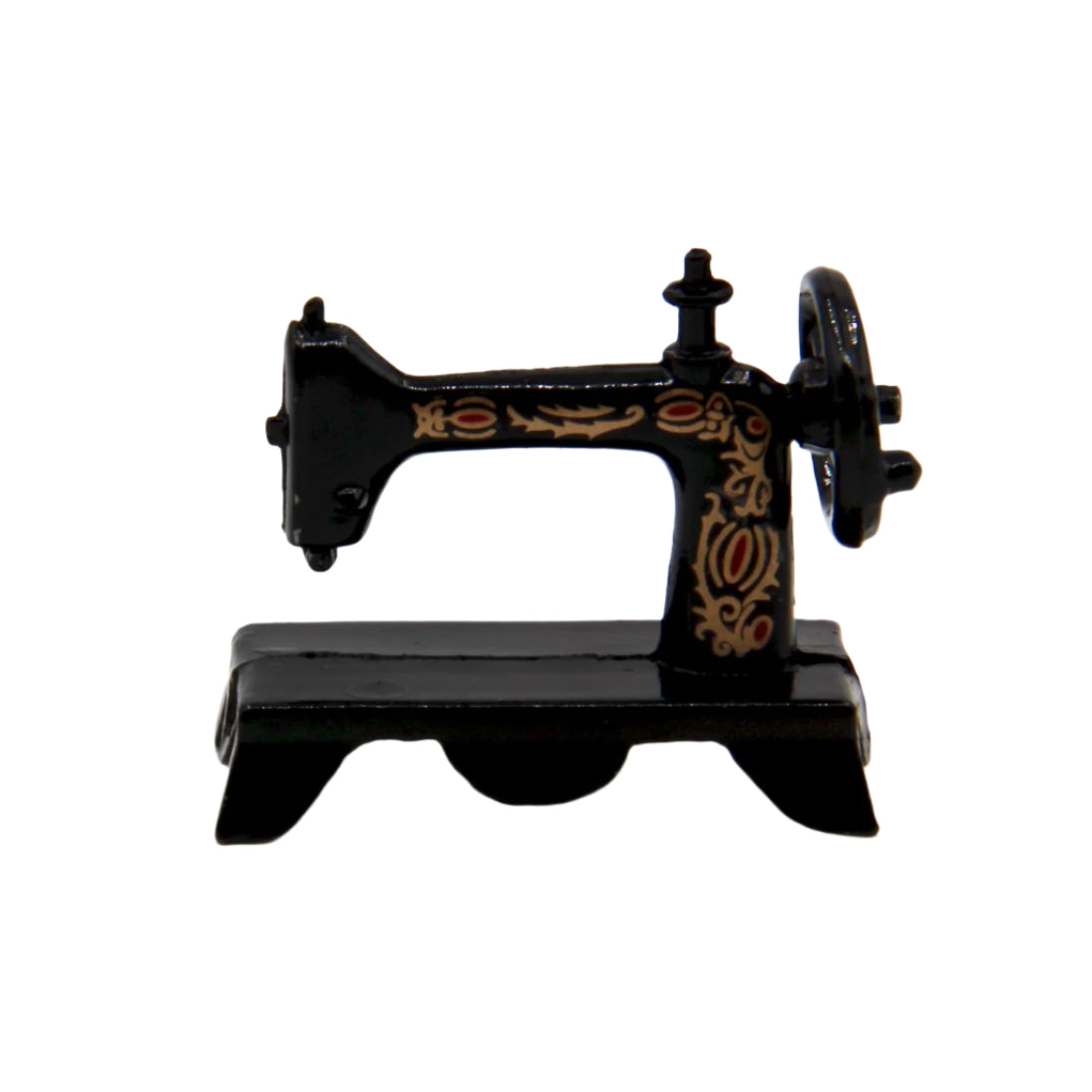 En graciös miniatyr symaskin att ställa på bordet. Bredd ca 3,4 x djup 1,5 x höjd 2,5 cm. De dekorativa målningarna finns bara på ena sidan.