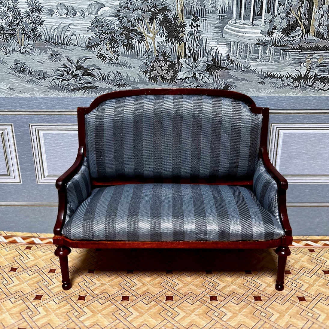 Se alla detaljerSnygg antik soffa med manchesterklädsel. Soffans bredd är ca 11,5 cm x djup 5 c höjd 8,5 cm. Graciös struktur av valnötsfärgat trä. Klädsel i my...
