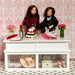 Den långhåriga kvinnan i den mörkröda kostymen böjer sina lemmar och passar för många sysslor i dockhuset.