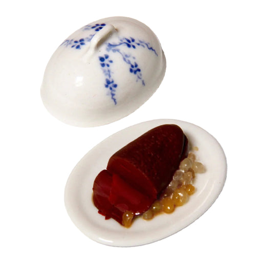Se alla detaljerEn handmålad blåvit porslinskupol med en mörkstekt stek eller skinkrulle under. Ovalt porslinsfat ca 3,8 x 3 cm. höjden på det hela med kupolen är...